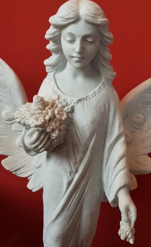 Angelo in marmo Bianco delle Cave Michelangelo, rappresentato mentre porge fiori dal mazzo.