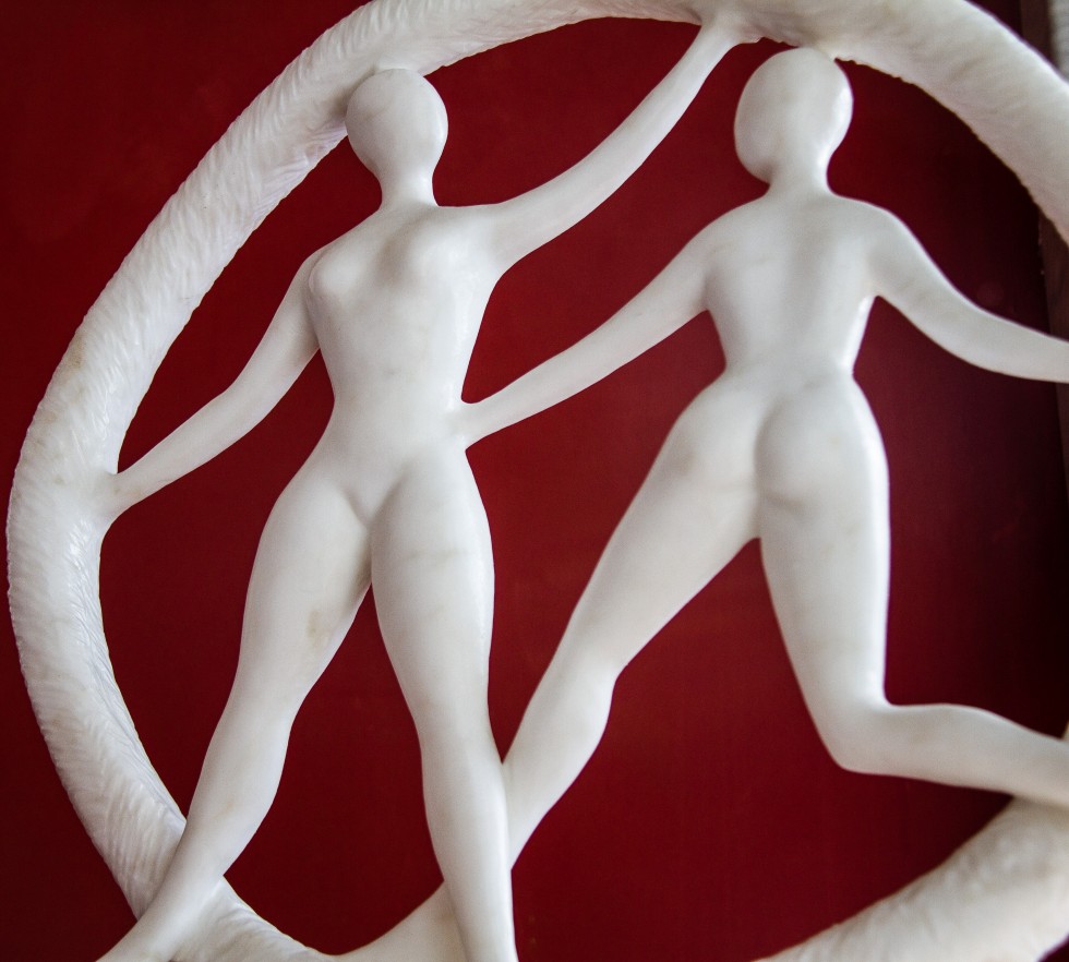 Tondo in marmo Statuario forato. Raffigurati corpi femminili stilizzati, su base in marmo Botticino.