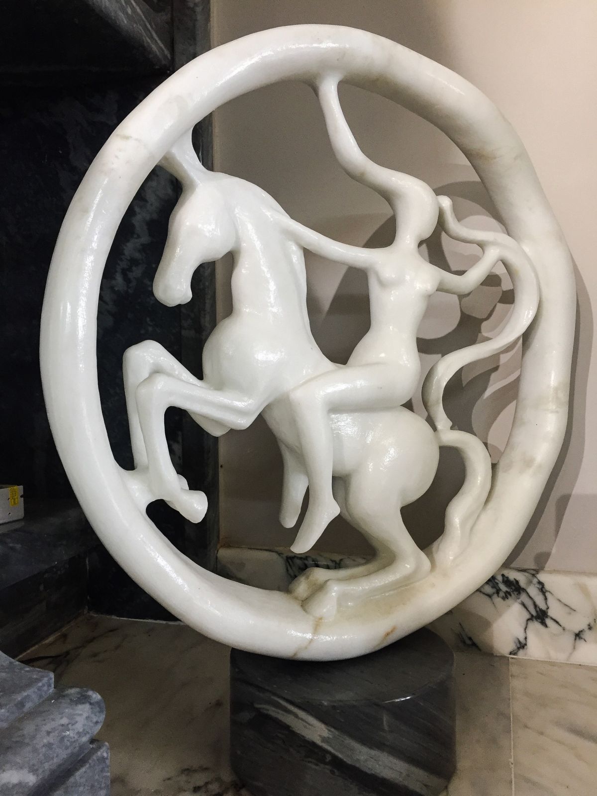 Tondo in marmo forato, raffigurante amazzone a cavallo, su base in marmo Nero Colonnata