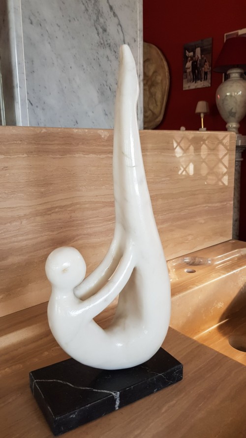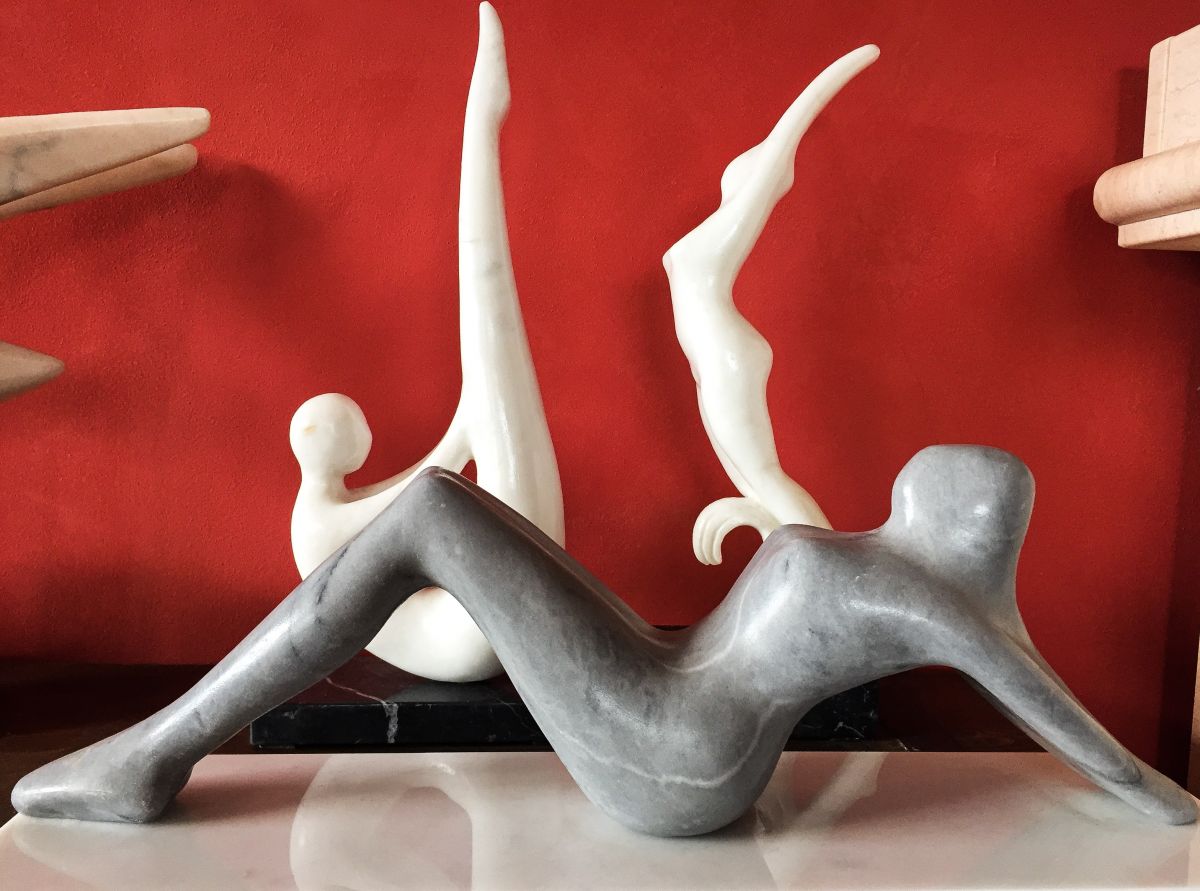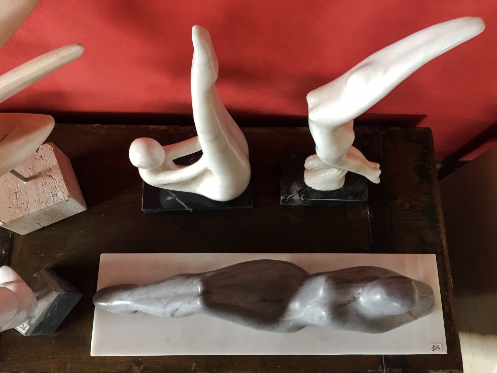 Sculture stilizzate di figure femminili in marmo Statuario e Nuvolato, ispirate alla rappresentazione di gesta atletiche.